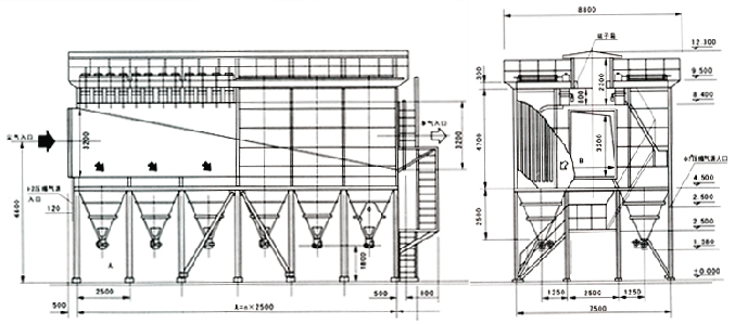 該除塵器采用逐行噴吹的方式,可通過噴吹管上開孔孔徑的變化,合理調節壓縮空氣噴吹到袋底的壓力,使其既能清灰徹底,又不損傷除塵布袋