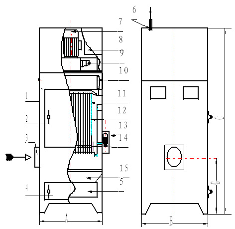 含塵氣體進入箱體,由扁布袋過濾器進行過濾,粉塵被阻留在除塵布袋外表面,已凈化的氣體通過濾袋進入風機,由風機吸入直接排入室內(也可接管排至室外)。
