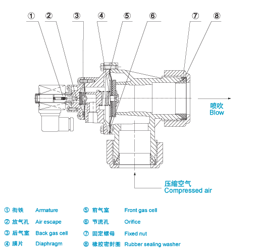 脈沖噴吹控制儀的電信號使電磁脈沖閥銜鐵后移,閥后氣室放氣孔打開,后氣室迅速失壓,膜片組件后移,壓縮空氣通過閥輸出口噴吹,電磁脈沖閥處于“開啟”狀態。