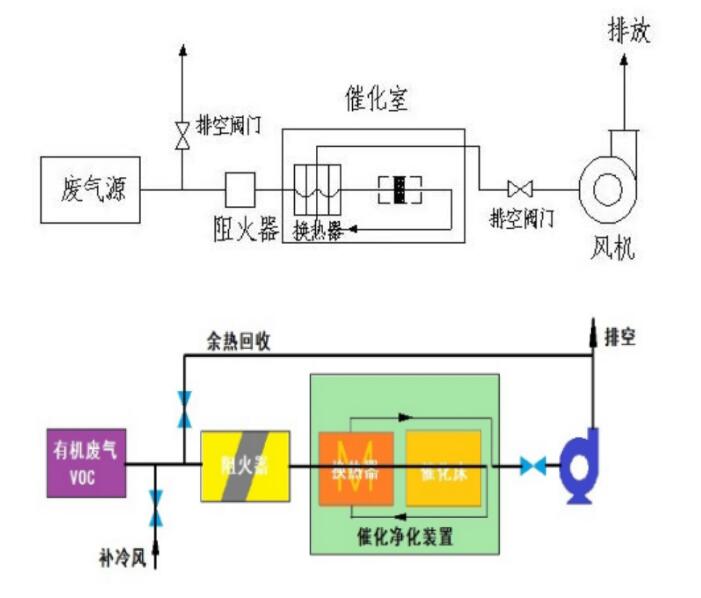 1.工藝原理 催化氧化技術(shù)(Catalytic Oxidizer,簡(jiǎn)稱CO),通常是指將廢氣加熱到280℃以上,在催化劑的作用下將廢氣分解成CO2和和H2O,催化產(chǎn)生的高溫?zé)崃勘话迨綋Q熱器進(jìn)行循環(huán)熱交換,從而節(jié)省運(yùn)行能
